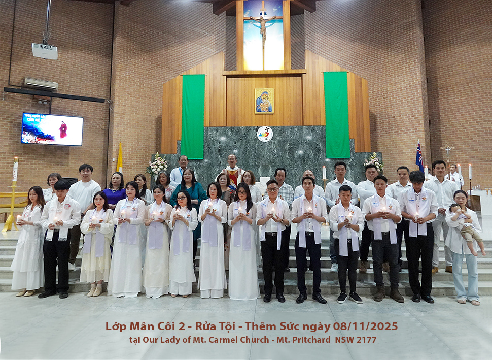 Sau ba tháng học hỏi Giáo lý để nhận biết Chúa và nhất là đã có cố gắng thực hành sống đạo, hôm nay vào lúc 7:00pm Thứ bẩy 08/11/2025, 13 em Dự tòng đã được diễm phúc lãnh nhận ba Bí tích Khai tâm: Rửa tội, Thêm sức và Thánh Thể để trở nên chi thể của Chúa Kitô và là con cái của Hội thánh, cùng với 2 trẻ nhỏ được Rửa tội, tại Nhà Thờ Our Lady of Mt Carmel, Mt. Pritchard NSW 2177.